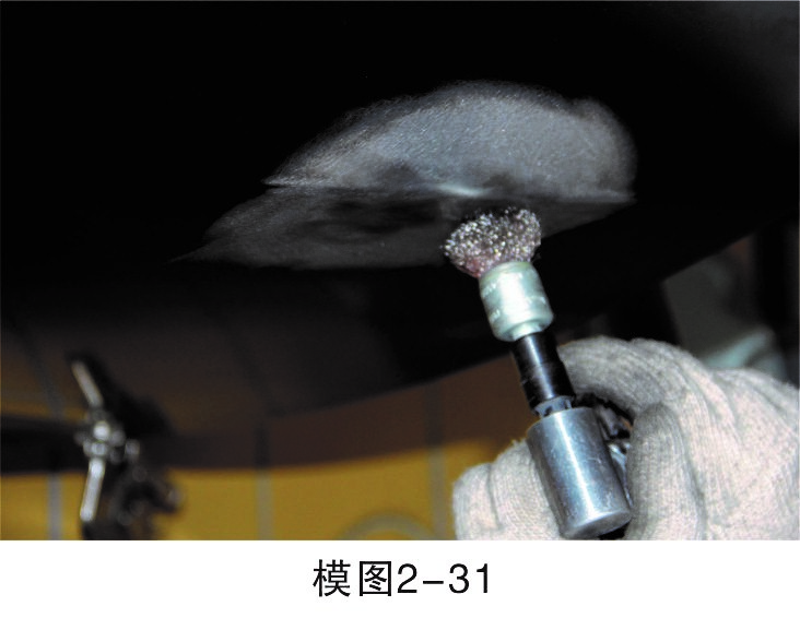 ④正式打磨。調(diào)試好微型打磨機以后,將打磨機的刷頭水平放置在需要打磨的工件的接縫、邊角、凹陷或者褶皺部位,然后開動開關(guān),由慢到快逐點打磨需要去除的損傷件表面舊涂層,如模圖2-31所示。